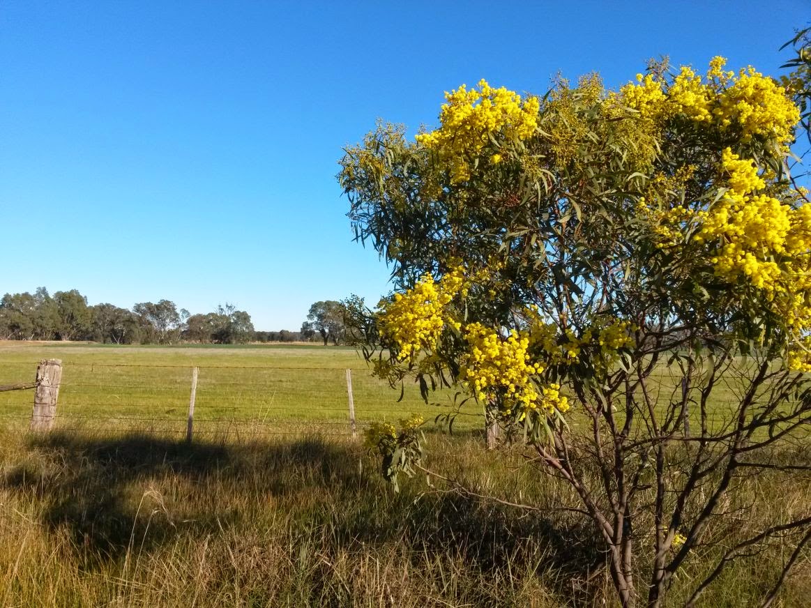 Last week I popped up to Bendigo to visit my SIL Raeleen who is not well at all (please keep her in your prayers), I had a lovely walk in the morning. Spring is definitely just around the corner, the beautiful Golden Wattle is out in all its glory. And there is a tiny bit of paddock fence just to keep it "fencey"